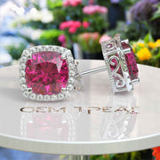 Rosy Radiance: Cushion Pink Sapphire Stud Earrings, Glimmering Moissanite Halo.
